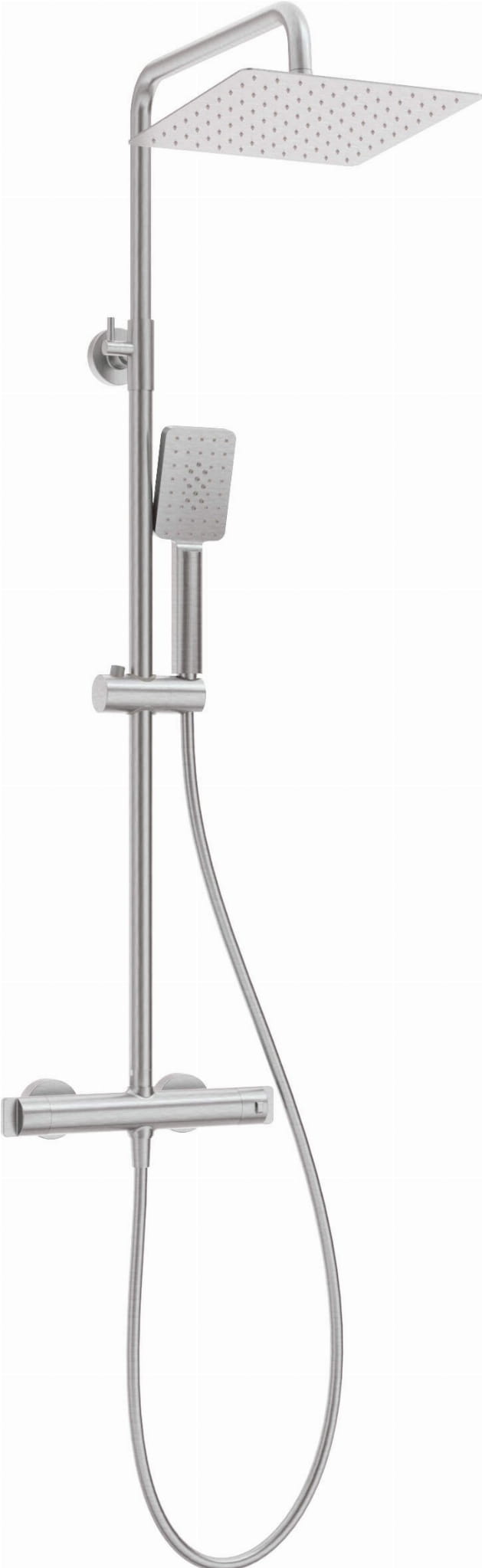 Deszczownica z baterią prysznicową termostatyczną firmy Deante w wykończeniu szczotkowanej stali.