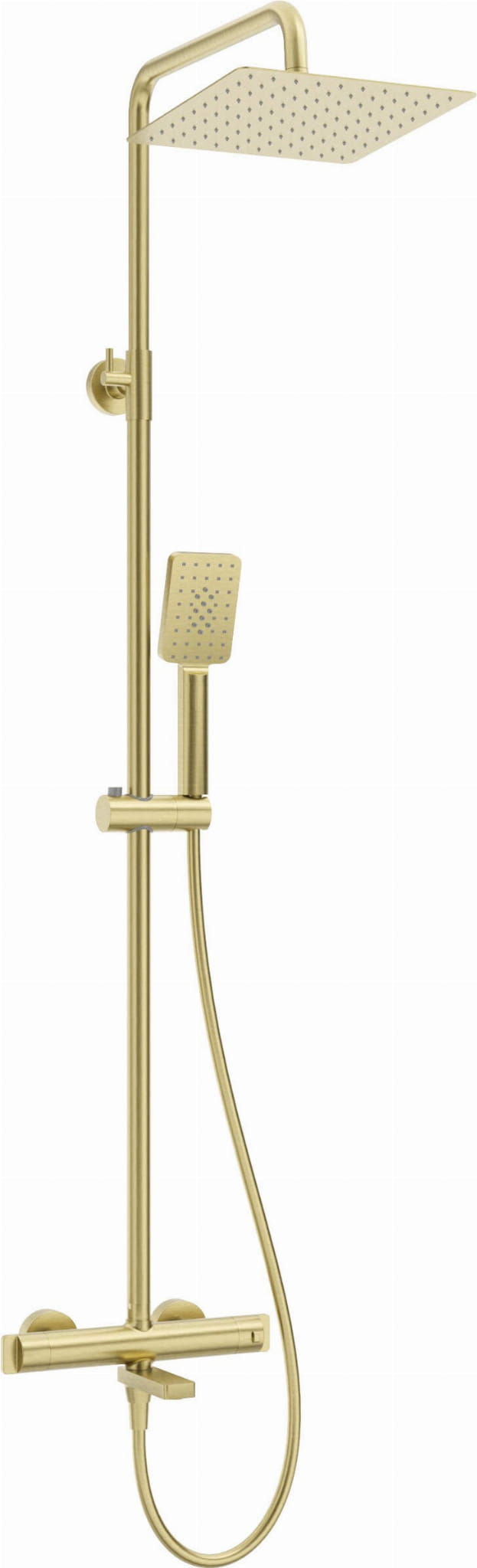 Deszczownica z baterią wannową termostatyczną firmy Deante w wykończeniu szczotkowanego złota.