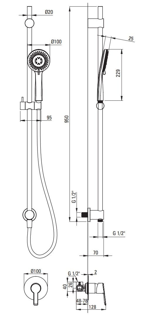 Zestaw prysznicowy Arnika składa się z podtynkowej baterii oraz słuchawki prysznicowej umocowanej na eleganckim drążku. Mosiężny uchwyt słuchawki jest ruchomy, można go przesuwać do dowolnej pozycji. Słuchawka prysznicowa wyposażona jest w 3 rodzaje strumienia: deszczowy, mieszany i hydromasaż oraz system Anti-calc, który ułatwia utrzymanie jej w czystości. Bateria wykończona jest w efektownym kolorze titanium, będącym kompromisem między szarością, ciemnym grafitem, czernią i brązem.