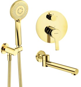 Komplet podtynkowy z wylewką wannową w złotym wykończeniu to bardzo przemyślany projekt. Bateria posiada prostą, wygodną dźwignię i mechaniczny przełącznik natrysku. Umożliwia on przełączenie źródła wody między wylewką a słuchawką prysznicową nawet przy małym ciśnieniu. Przyłącze kątowe wykonane jest z wysokiej jakości mosiądzu, który gwarantuje niezawodność i długowieczność produktu. Ruchomy element pozwala na precyzyjne ustawienie słuchawki i dostosowanie jej do swoich potrzeb. Składana wylewka to bardzo funkcjonalne rozwiązanie. Podczas kąpieli, po napełnieniu wanny wodą, należy złożyć ją równolegle do ściany. Tym samym zyskasz dużo miejsca, a w przypadku małych dzieci, bezpieczną przestrzeń do zabawy. Wąż PCW w wykończeniu Gold posiada w komplecie kryzę redukującą zużycie wody w prysznicu do 6l/min. Dzięki zastosowaniu systemu anti-twist wąż nie skręca się. Słuchawka natryskowa ma 3 strumienie: deszczowy, hydromasaż, mieszany.