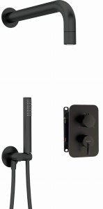 Komplet prysznicowy z BOXem mieszaczowym Silia to połączenie nowoczesnych rozwiązań z minimalistycznym designem. Składa się z wylewki z małą głowicą prysznicową, baterii podtynkowej mieszaczowej oraz słuchawki natryskowej z wężem i uchwytem punktowym. Główka natryskowa zapewnia optymalny, stożkowy strumień wody, co gwarantuje wyjątkowy komfort kąpieli. Bateria podtynkowa mieszaczowa z łatwym przełącznikiem umożliwia sprawne przełączenie strumienia wody między słuchawką a wylewką. Dodatkowo, słuchawka prysznicowa wyposażona w system cool-out nie nagrzewa się, zwiększając bezpieczeństwo i komfort, a wąż prysznicowy z systemem anti-twist zapobiega skręcaniu, co podnosi wygodę użytkowania. Montaż podtynkowy gwarantuje estetyczny wygląd i ułatwia utrzymanie w czystości. Całość jest dopracowaną kompozycją w czarnym, matowym wykończeniu.