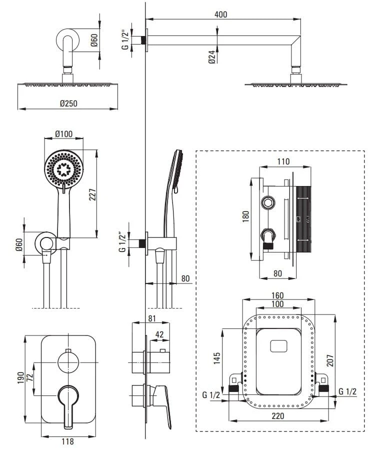 - Box podtynkowy wyposażony jest w wygodny przełącznik strumienia między słuchawką a deszczownicą.