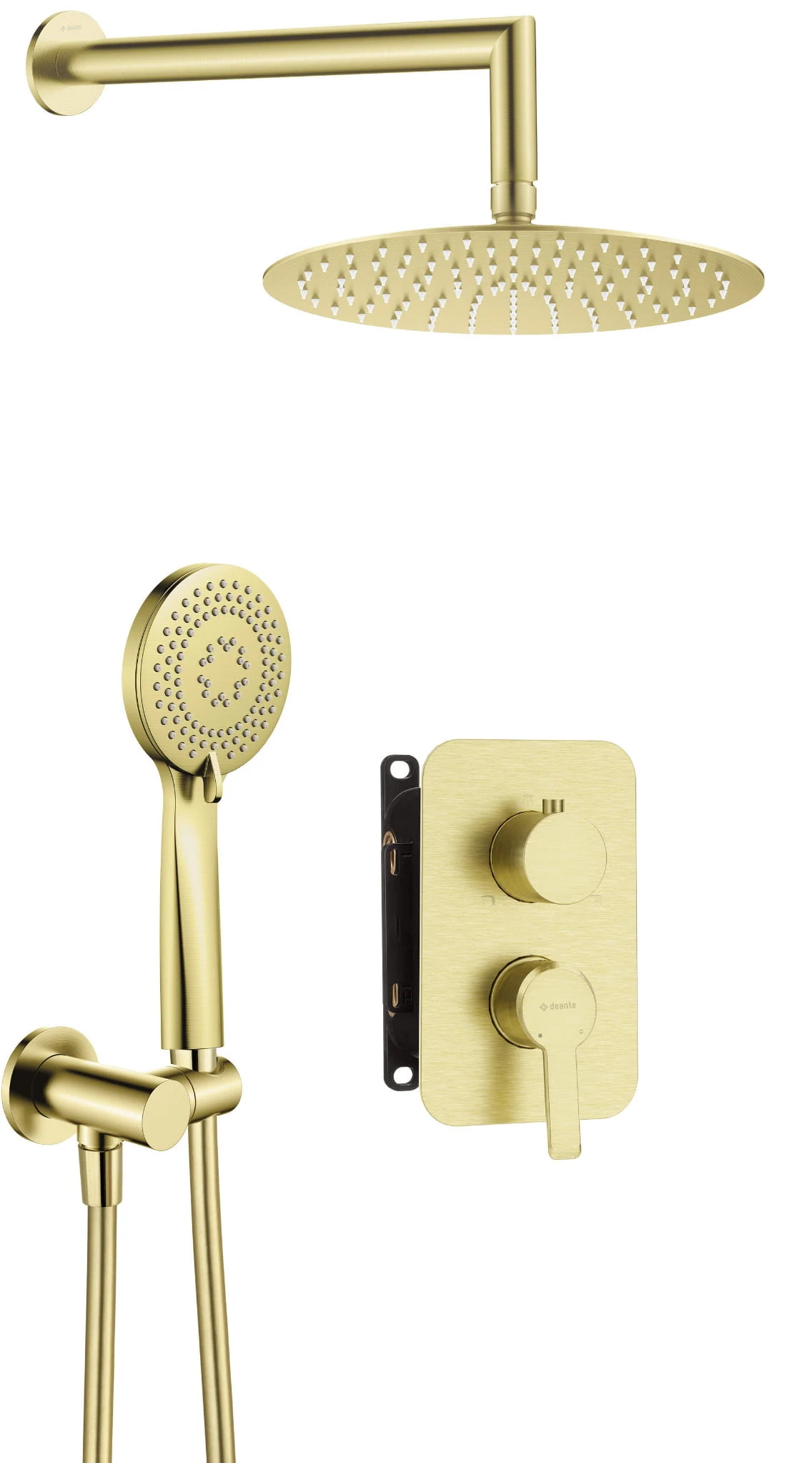 Zestaw prysznicowy podtynkowy z BOXem mieszaczowym Arnika firmy Deante w wykończenie szczotkowanego złota.