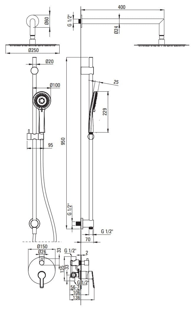 W skład zestawu wchodzi słuchawka prysznicowa z wężem, umocowana na eleganckim drążku, głowica natryskowa oraz bateria podtynkowa. Uchwyt słuchawki można przesuwać do dowolnej pozycji, w zależności od wzrostu domownika. Słuchawka prysznicowa posiada 3 funkcje strumienia: strumień deszczowy, mieszany i hydromasaż. Wyposażona jest także w system Anti-calc, który ułatwia czyszczenie jej z osadu oraz kamienia. Jednouchwytowa bateria natryskowa charakteryzuje się prostą i wygodną dźwignią i mechanicznym, ceramicznym przełącznikiem natrysku, który umożliwia łatwe przełączenie źródła wody między deszczownicą a słuchawką prysznicową, nawet przy niskim ciśnieniu wody.