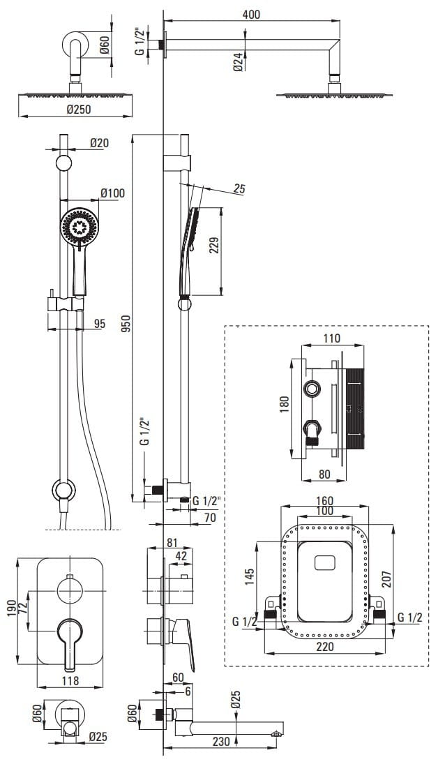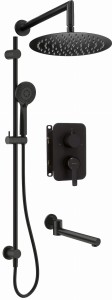 Komplet podtynkowy Arnika składa się z drążka ze słuchawką i głowicą deszczową, ze składanej wylewki oraz z boxa mieszaczowego z przełącznikiem natrysku. Uchwyt słuchawki można przesuwać do dowolnej pozycji. Słuchawka oraz głowica deszczowa wyposażone są w system Anti - calc, ułatwiający czyszczenie ich z osadu i kamienia. Wylewkę można podczas kąpieli złożyć równolegle do ściany. Komplet wykończony jest w modnym czarnym matowym kolorze.