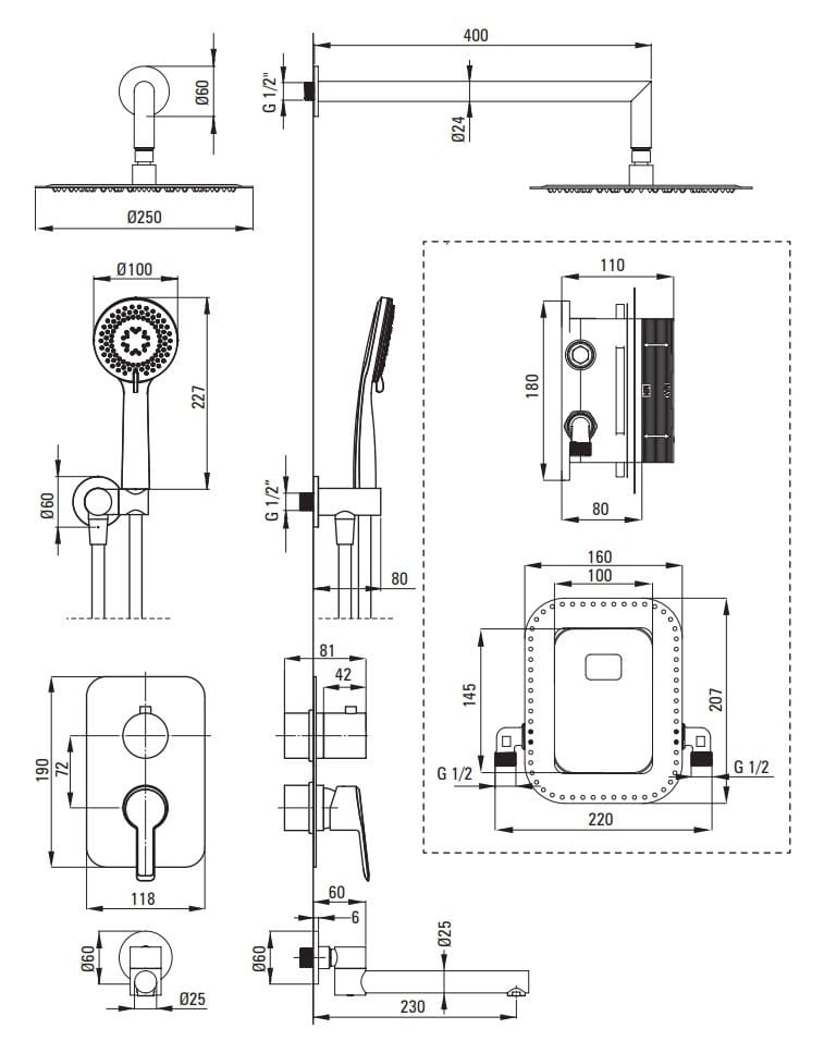 Zestaw składa się z boxa podtynkowego mieszaczowego, głowicy prysznicowej, ruchomej wylewki i słuchawki prysznicowej z wężem i przyłączem kątowym. Zaletą boxa jest prosty sposób montażu i minimalistyczny design. Głowica prysznicowa jest bardzo cienka i wykonana z wysokogatunkowej stali nierdzewnej. Ruchoma wylewka pozwala na złożenie jej równolegle do ściany, co sprawdzi się w mniejszych łazienkach. Przyłącze kątowe posiada regulowany kąt nachylenia słuchawki, dzięki czemu można ją dostosować do indywidualnych potrzeb.
