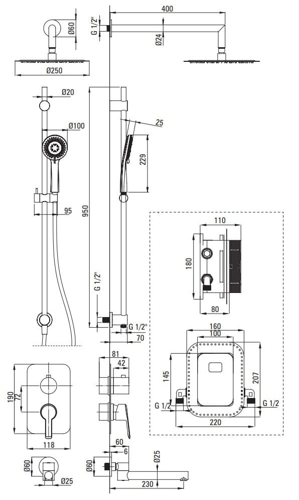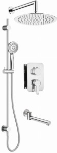 Zestaw podtynkowy Arnika składa się z drążka ze słuchawką i głowicą deszczową, ze składanej wylewki oraz z boxa mieszaczowego z przełącznikiem natrysku. Uchwyt słuchawki można przesuwać do dowolnej pozycji. Słuchawka oraz głowica deszczowa wyposażone są w system Anti - calc, co ułatwia czyszczenie ich z osadu i kamienia. Wylewkę można podczas kąpieli złożyć równolegle do ściany, zyskując dodatkowe miejsce.