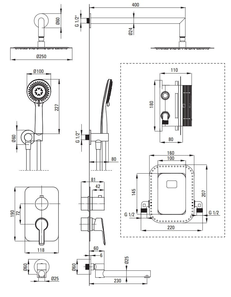 Zestaw Arnika składa się z boxa podtynkowego mieszaczowego, głowicy prysznicowej, ruchomej wylewki i słuchawki prysznicowej z wężem i przyłączem kątowym. Zaletą boxa jest łatwy sposób montażu i minimalistyczny design. Głowica prysznicowa jest ultra cienka i wykonana z dobrej jakości stali nierdzewnej. Ruchoma wylewka pozwala na złożenie jej równolegle do ściany. Przyłącze kątowe posiada regulowany kąt nachylenia słuchawki.