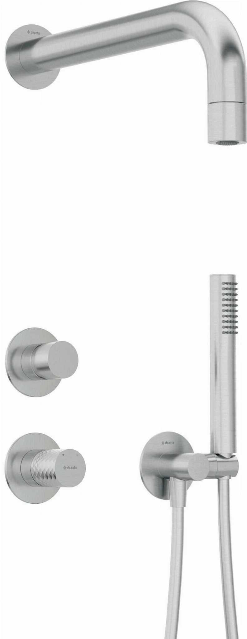 Zestaw prysznicowy podtynkowy z główką prysznicową Silia Hexa firmy Deante w kolorze szczotkowanej stali.