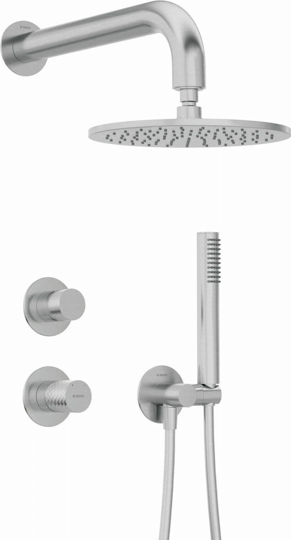 Zestaw prysznicowy podtynkowy z głowicą prysznicową Silia Hexa firmy Deante w kolorze szczotkowanej stali.