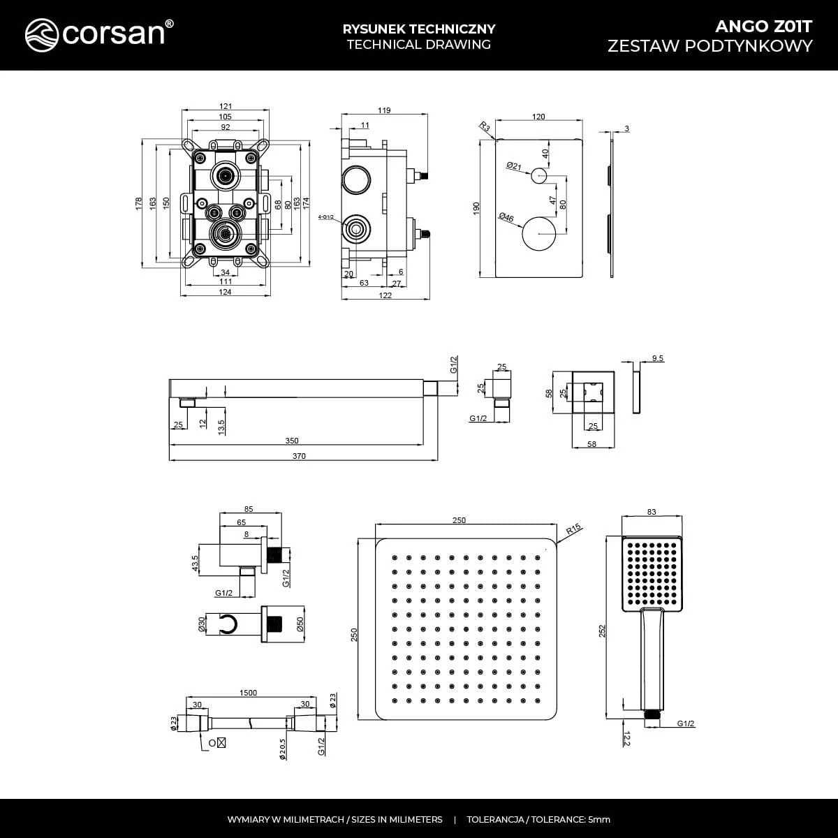 Zestaw prysznicowy ango z01tgm 2-funkcyjny z deszczownicą 25cm