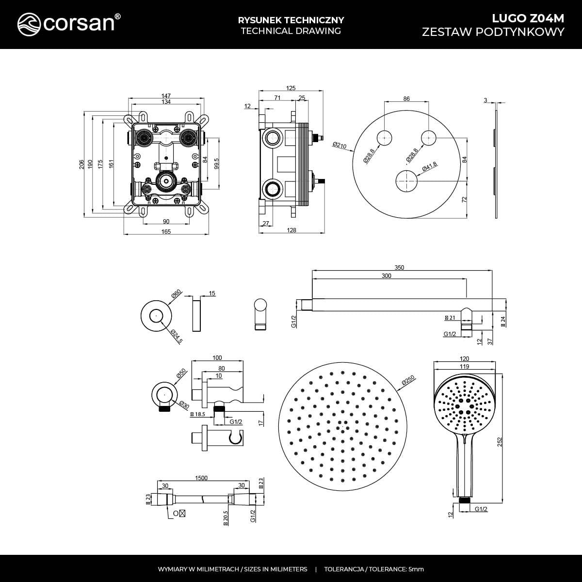 Zestaw prysznicowy lugo z04mgm deszczownica 25cm mieszacz słuchawka prysznicowa gunmetal