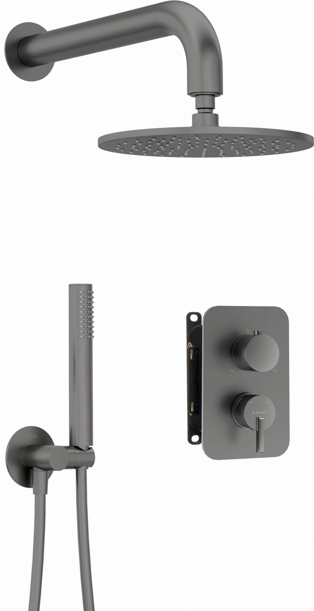 Zestaw prysznicowy podtynkowy z BOXem mieszaczowym z głowicą prysznicową Silia firmy Deante w wykończeniu titanium.