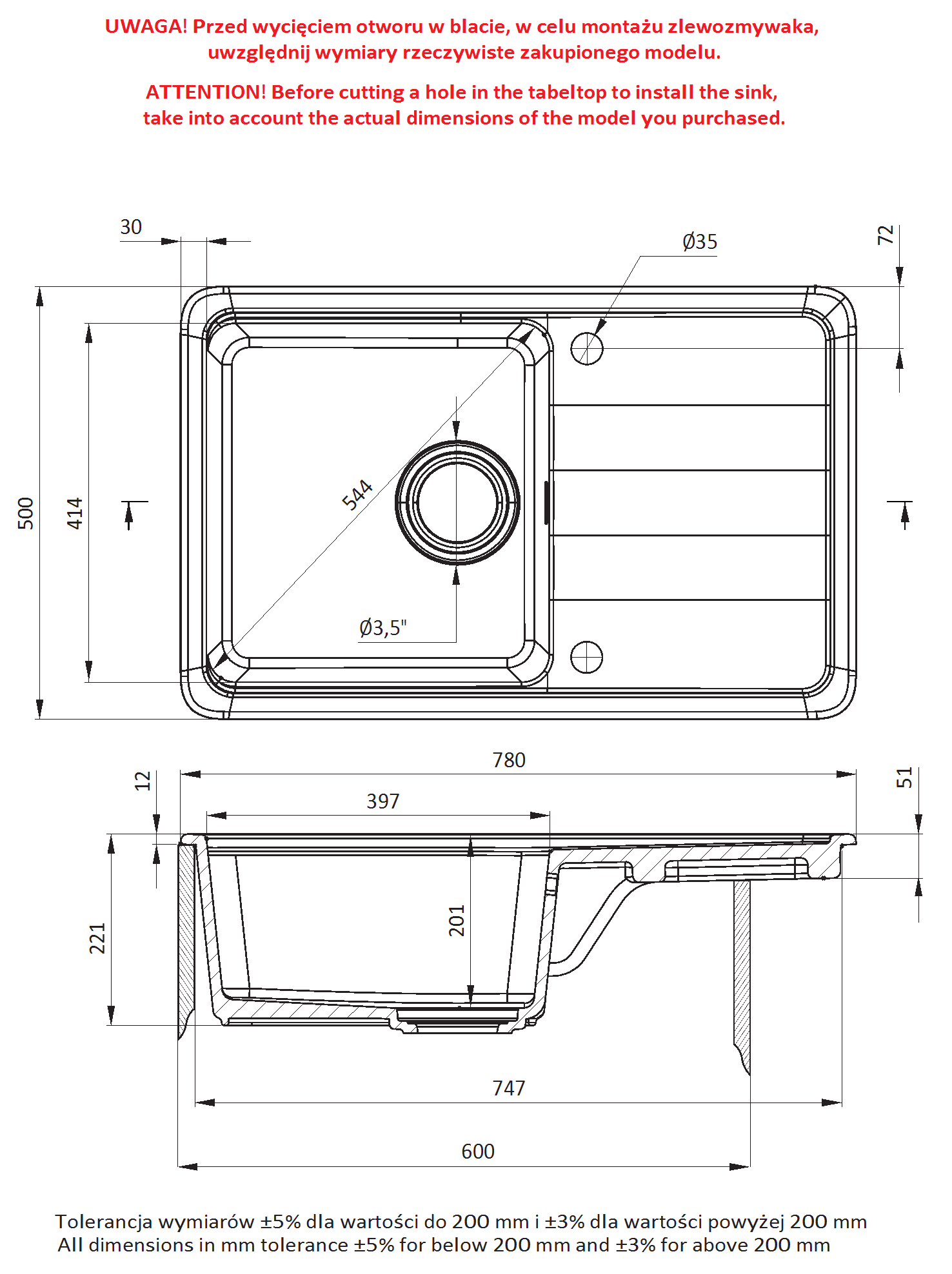- UWAGA! Przed wycięciem otworu w blacie, w celu montażu zlewozmywaka, uwzględnij wymiary rzeczywiste zakupionego modelu.