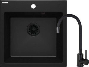 Zlewozmywak granitowy czarny 1-komorowy Evora z czarną baterią kuchenną Luno firmy Deante