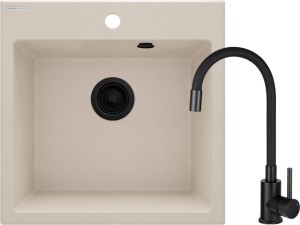 Zlewozmywak granitowy beżowy 1-komorowy Evora z czarną baterią kuchenną Luno firmy Deante