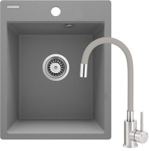 Zlewozmywak granitowy z baterią tworzy kompletny zestaw do kuchni. Powstał z wytrzymałego, naturalnego granitu, który jest odporny nie tylko na wysoką temperaturę i jej wahania, ale także na uderzenia i przebarwienia, zgodnie z normą europejską PN-EN 13310. Dodatkowo został wzbogacony warstwą hydrofobową, ułatwiającą spływanie pojedynczych kropel. W tej samej kolorystyce jest też bateria z wygodną wylewką. Praktyczny, niewielkich rozmiarów 1-komorowy zlewozmywak to doskonałe rozwiązanie w małych kuchniach i kawalerkach z aneksem.